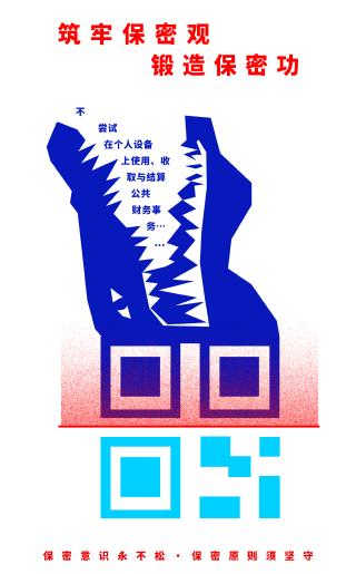 潘贺哲等老师的作品《筑牢保密观,锻造保密功》:该组海报直面企事业单位员工,通过将银行卡、二维码等高频职场元素转化为视觉警示,直击“个人设备处理公务”的风险痛点,实现了高效的教育与警示作用。
