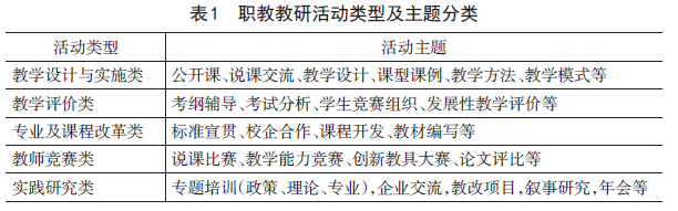 教研是以组织活动为主要载体和实现方式,重在打造一线教师教学共同体。教科研项目或课题的结果指向明确,包括完成报告、论文等,而教研是为了促进教师的专业化发展,其结果难以量化,且见效周期较长。因此,教研常常以参与教研活动的规模或举办教研活动的次数来衡量。教研活动的主题源自职业教育教师专业化发展的需要以及教学实践遇到的问题。活动的形式一般包括:观摩交流、比赛评比、课题研究、专题培训等。例如,公开课观摩交流是最受教师们欢迎的教研活动,其与教学最接近,具有非常强的示范性。再如,举行比赛评比是最有号召力的教研活动,以赛促研、以研促教,可以扩大教研影响力。