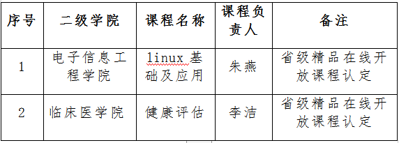 根据《教育部办公厅关于开展 2022 年职业教育国家在线精品课程遴选工作的通知》(教职成厅函〔2022〕18号)精神,结合我校《关于遴选国家在线精品课程培育项目的通知》工作安排,经课程负责人自主申报,二级学院推荐,教务处组织专家评审,拟确定《linux基础及应用》、《健康评估》两门课程为首批国家在线精品课程培育项目,现将遴选结果予以公示,公示期3天(2022年12月15日—2022年12月18日)。