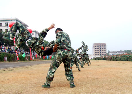 院长刘演林在副院长颜彩飞、承担本次军训任务的武警邵阳支队副支队长刘日升的陪同下检阅了雄壮的军训队伍。随后,举行盛大的阅兵式。在教官的带领下,新生们迈着整齐的步伐,雄赳赳、气昂昂地走过主席台前,接受全体领导的检阅。军训教官们还进行了综合倒功表演,他们的动作虎虎生威,赢得了大家热烈的掌声和欢呼。
