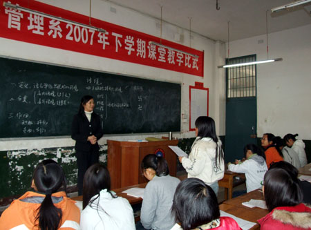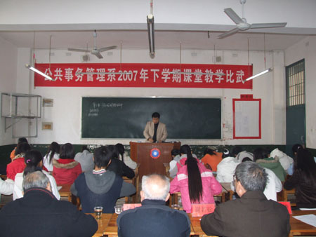 为进一步优化课堂结构,实施有效教学,12月1日,公共事务管理系举办2007年下学期课堂教学比武,邹友松、曾慰南、谢若松等老领导、教务科科长张一平饶有兴致地观摩了课堂教学比武。