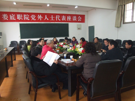 1月10日下午,我院07年度党外人士代表座谈会在实训楼207会议室召开。党委书记陈立楚、党委副书记彭建胜、组织人事处处长李新红、宣传统战部部长王宗凡、省政协委员、九三学社娄底职院支社主委胡拥军、市政协委员李翠兰、院科协主席、民盟会员罗正斌、无党派人士张海筹、游新娥等出席了座谈会。大家欢聚一堂,总结过去,畅谈未来,共话发展。