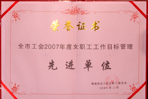 娄底市工会2007年度女职工工作目标管理先进单位荣誉证书