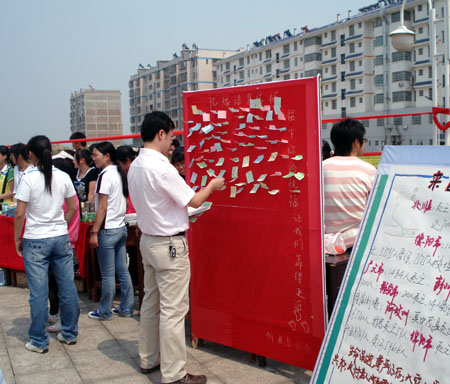 本次活动还得到了院团委、学工处和其他社团的声援。书法协会将一部分会员的优秀作品捐赠出来义卖。漫妖协会专门为本次义卖活动制作了一块许愿牌,让同学们将对灾区人民的祝福和祈祷写在许愿牌上。(文/钟琼 刘艳 图/王宗凡 杨正强 曾春桃)