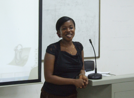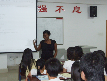 Linda,加纳人,毕业于加纳名校Cape Coast大学,获教育与英语文学学士学位,具有五年教学经验,在中国任教三年,对中西语言文化有独特的感悟,长于课堂教学、情景教学,善于调动课堂气氛,讲课深受广大师生喜爱。(文/外语系网络编辑部 杨正强 图/杨正强)