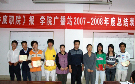 10月17日,《娄底职院》报、学院广播站2007―2008年度总结表彰大会暨迎新大会在主教学楼110举行。湖南省作家协会会员、学院党委宣传统战部部长王宗凡副教授、院报编辑刘艳老师、学院网络管理中心欧阳琦老师出席会议并为获奖学生记者颁奖,《娄底职院》报、学院广播站全体成员参加了会议。大会由学院广播站站长刘艺梁主持。