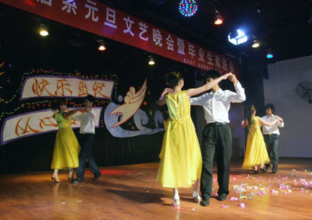 晚会在充满青春活力和动感的健美操《阿里阿里》中拉开帷幕。整台晚会形式多样,健康向上,为全系师生奉献了一场丰富多彩的视听盛宴。激情四射的舞蹈,妩媚多姿的西班牙女郎、青春动感的街舞以及让人捧腹大笑的小品《第一次见面》等精彩纷呈的节目,将晚会推向一个又一个高潮,赢得一阵又一阵掌声。晚会最后在毕业生带来的朗诵《我们要毕业了》中落下帷幕。(吴莲贵 杨正强)