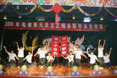 为了活跃校园文化生活,喜迎新年,电子信息工程系于12月28日晚在南院学生活动中心隆重举办了2009年元旦晚会暨06级毕业生欢送会。院团委书记杨惠梅、系主任吴莲贵、系党总书记唐毅慈、教学主任游新娥出席晚会并和全系师生共同观看了演出。