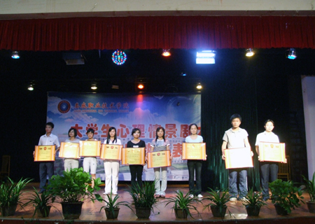 在心理情景剧比赛中,8个参赛团体表演的节目内容充实、寓意深刻,充分突出了“和谐人际,健康心理”这个主题。演员们用他们深情的表演把大学生在生活中因为就业压力、家庭困难、人际关系不和谐等因素而引发的抑郁、情感困惑、价值观迷失等心理问题演绎的淋漓尽致。经过精彩的角逐,由公共事务管理系和心理健康协会分别选送的《青春纪念册》、《525~家》夺得本次心理情景剧比赛的一等奖。院团委书记杨惠梅现场对同学们的表演作了精彩点评。