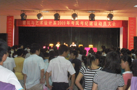 6月22日晚上18:50,建艺系在南苑礼堂召开了2009年考纪考风建设动员大会。全系师生参加本次大会,大会由副主任曾素纯主持。会上,系主任夏高彦、副主任李清奇、曾素纯分别作了重要讲话。