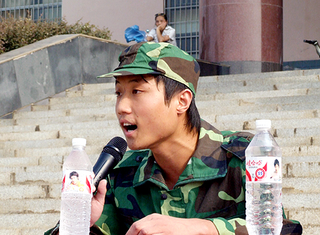 武警娄底支队教导大队大队长孙青柏发表讲话。他从“端正思想认识”、“树立吃苦意识”、“强化服从意识”及“配合教官工作”四个方面向新生们提出了建议和希望。新生代表周航在发言中回应,2009级新生一定不负众望,坚决以立志成才的激情、战胜困难的决心来面对入校后的第一个挑战,从而树立良好的新生形象,塑造崭新的精神面貌。