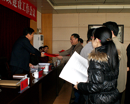 工作报告后,“争当廉洁自律表率”代表一一发言。后勤处处长李济民向学院党委行政承诺廉政建设要从身边小事、细节抓起,绝不让点滴之财玷污自己的品格。财贸系主任周志和表示将注重领导班子自身建设,注重系部队伍培养,注重系务公开,注重系里中心工作及思想教育。组织人事处科长封权初也表态,将认真、扎实学习会议精神,严于律己、廉洁从政、坚定立场、豁达处事,时刻保持一种奋发向上的精神状态。随后,各处室系部向党委递交了党风廉政建设责任书。