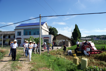 7月22日,副市长刘益丈、市政府副秘书长江克美率领娄底市县农机局负责人来到我院新农村建设综合实验基地――娄底经济开发区中阳村,现场观摩考察在这里进行收割作业的湘圆牌4LZ-1.4和4LZ-1.0联合收割机的工作情况。我院党委书记陈立楚、副院长周意坚、湘丰娄职农业装备有限公司总经理李秋溪、中阳村党支部书记陈湘春等陪同考察。