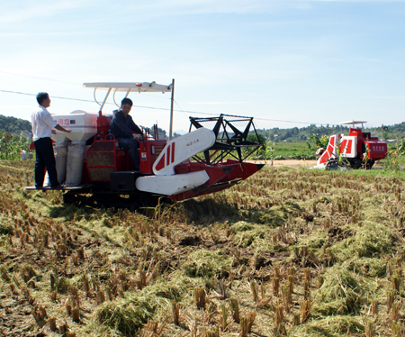 刘益丈一行冒着酷暑来到田间时,三台崭新的鲜红色收割机已经在田里工作得热火朝天。不到十分钟功夫,一台收割机便将一片稻田收割完毕。刘益丈、江克美与娄底市农机局局长胡桂秋等人来到装满稻谷的袋子前,仔细观看收割下来的的稻粒和田土上留下的秸杆,连连点头:“秸杆返田率很好,尤其是稻粒相当干净。”李秋溪向大家介绍,4LZ-1.4和4LZ-1.0联合收割机不但非常适应南方丘陵地带的收割作业,同时收割、脱粒、清理可以一次完成,农民打下来的成品,只要经过晾晒就可以直接收仓。大型收割机平均每小时可以收割4亩地左右,大大降低了农民的劳动强度。陈立楚表示,作为娄底职院的产学研合作单位,湘丰娄职农业装备有限公司研制的收割机正为我院的院村合作基地中阳村免费收割200亩稻田,目前稻田已经收割大半,收割机工作良好,中阳村农民应用新技术的热情也日益高涨。刘益丈饶有兴致地观看着收割机的工作情况,认为这种农机非常实用,值得推广。她在随后的交流中,希望我市各级农机局为本土自主品牌的发展与营销架桥铺路,将更多更好的农业新技术引入田间。(刘艳)