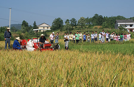 据悉,湖南湘丰娄职农业装备有限公司从7月15日开始,已帮助中阳村、茶园乡等娄星区乡镇收割200余亩早稻,至8月5日结束早稻收割工作。9月初,还将帮助小碧乡等乡镇收割一季稻。在7月22日中阳村的收割机现场演示过程中,湘丰娄职农业装备有限公司的4LZ-1.8、4LZ-1.4、4LZ-1.0、4LZ-0.8等型号收割机获得了娄底市副市长刘益丈、副秘书长江克美、娄星区副区长肖雄杰、市农机局局长胡桂秋等领导和各县市区农机局分管项目局长、推广站长、农机专家的高度评价。演示结束后,领导、专家就收割机性能、质量举行座谈,一致认为,此类收割机操作灵活、作业质量好、谷粒含杂率少,很适合丘陵山区水田作业。产品性能稳定、操作简便、效益好,特别是4LZ-1.4型收割机获得多项国家专利,其最大的创新点是行走履带正反旋转和先进的清选机构,再配备旋耕机进行作业,一机两用,极有优势。市农机局胡桂秋局长提出,希望湘丰娄职农业装备有限公司加大力度推广产品,占领娄底市场乃至国内市场。