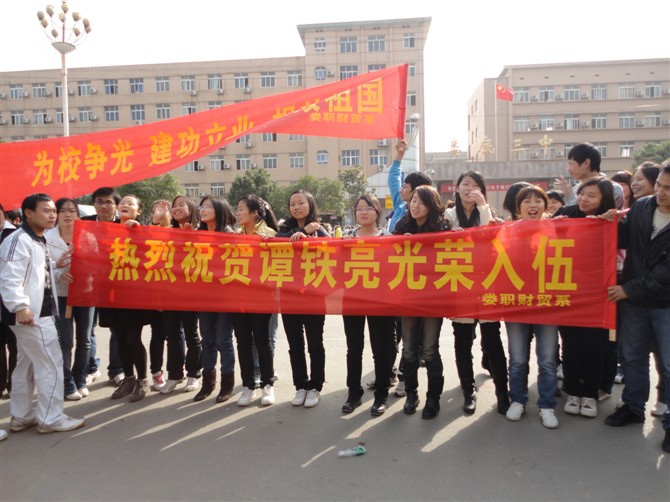11月22日下午2:00,财贸系众多学子在张一军副主任的亲自组织下,打着“为校争光,建功立业,报效祖国”、“热烈祝贺谭铁亮光荣入伍”的横幅齐聚娄星区人民武装部门口,共同欢送远征西藏的优秀大学生――谭铁亮。