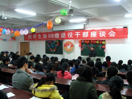 12月8日,户外虽寒风嗖嗖,主教楼110教室却是一片温情。当日晚,院学生会举办08级退役干部座谈会暨欢送会。副院长刘自斌,学工处处长刘罗仁出席并讲话,大会由院学生会宣传部部长丁水红主持。全体院学生会干部参加欢送会。