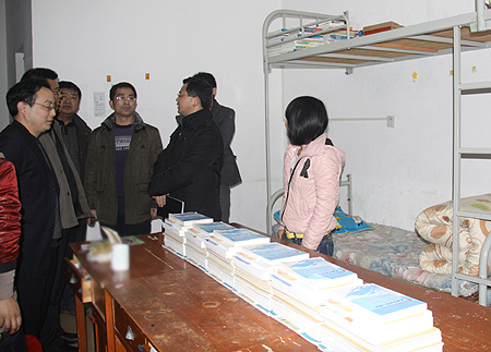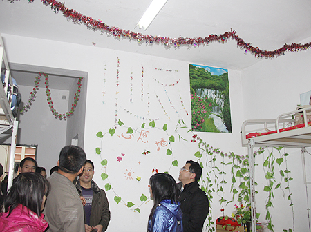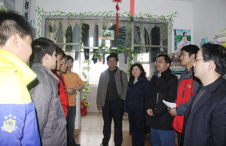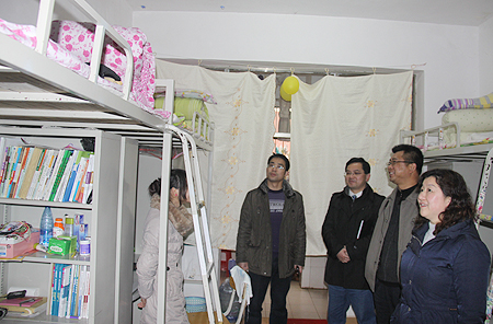 郭广军首先向全体学工管理人员提出了学生管理的几点具体要求,强调要做到四个确保:一是要加强安全教育和安全管理,确保校园的平安和谐稳定,特别强调要做好两会期间学生的思想稳定工作;二是要加强和创新宿舍管理,有效推进宿舍文化建设,确保学生宿舍的文明与活力;三是要增加宿舍建设的投入,确保学生宿舍环境条件的不断改善;四是要加强宿管队伍建设,确保辅导员和宿管人员待遇要逐步提高。在学生寝室,郭广军向同学们送出了兔年的祝福,希望大家在新的一年里要有新的气象和新的进步,关切地询问了同学们的饮食、生活、用水用电及安全等情况,了解大家在生活和学习上的困难,表示学校也一定会采取相关措施,及时解决同学们提出的各种问题和困难,为全面构建平安和谐、绿色文明的校园环境不懈努力。在机电系、外语系和公管系等系部的一些院级文明寝室,不但室内整洁有序,墙上还贴了很多人生启迪标语及书法作品和各种装饰物,营造了一种和谐温馨、生机勃勃、奋发向上的文化氛围。郭广军指出,宿舍是大学生生活、学习、交往的主要场所,是大学生思想道德建设的重要阵地。加强宿舍文化建设是加强学生管理、提高大学生思想道德水平的重要举措。今后要注意在宿舍文化建设方面加强学生管理。在农林系的藏族女生寝室,郭广军特别叮嘱学工主任易瑜要格外关心少数民族学生的学习生活,要尊重他们的生活和风俗习惯,安排好藏族学生过好藏历新年,要特别注意做好少数民族学生的各项工作。