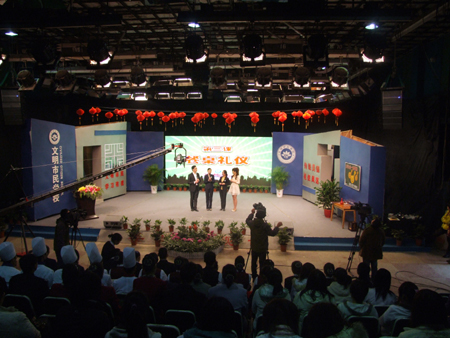 3月15日下午,受娄底市创建全国文明城市工作领导小组办公室、娄底电视台新闻综合频道邀请,在我院党委副书记欧友佳、学工处处长张一军、公共事务管理系雷晚蓉主任的大力支持下,由我院院学生会主席王炜、院团委负责人丁时红,公共事务管理系学生会主席刘乐带队,院学生会干部及公管系酒店管理班的部分学生来到频道演播大厅,参加“文明市民学校?D?D餐桌礼仪”的节目录制。
