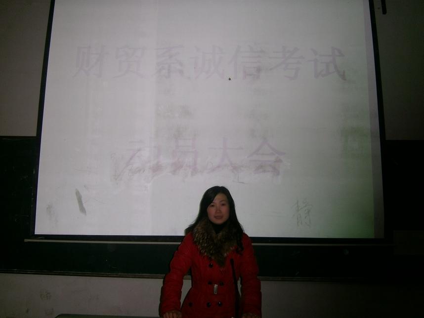 系部教学主任朱阳生和学工主任刘媛于2011年12月28日晚7:30在主教学楼教室为11级各班学生代表进行了诚信考试动员,朱阳生就考场规则及考前准备工作作了讲话,刘媛对考试中的注意事项进行了详细讲解。(财贸系)