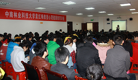 3月29日上午,中南林业科技大学心理中心主任袁红梅教授来我院作大学生心理健康教育讲座,各系学工主任、学生干事、全体辅导员、院系学生会心理健康教育部成员、11级各班的心理委员共140余人聆听了讲座。讲座由学工处副处长戴志鹏主持。