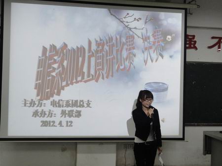 4月12日晚上电信系在主教学楼410举行了演讲比赛总决赛,电信系学工主任李规、学工干事佘彬、辅导员曾凤娇、彭继光、李韶辉老师和学生会主要干部及各班代表观摩了本次决赛。
