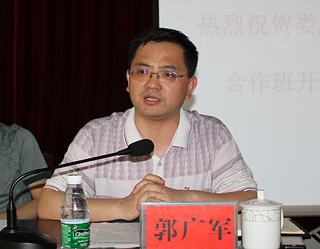 郭广军在讲话中向电信系和慧锐通公司的成功合作表示热烈祝贺,他对双方校企合作、产学结合、订单培养的进行提出了五点建议。一是着力把牢校企合作的基本宗旨,共同创新校企合作办学机制体制;二是着力夯实校企合作的基本内容,共同创新工学结合人才培养模式;三是着力推进校企产学研合作,共同创新师资队伍能力水平建设;四是着力促进校企资源共享,共同推进生产性实习实训条件建设;五是着力加强校企合作管理,共同推进人才培养质量保障体系建设。他还对在座的同学们提出了三点希望:坚持积极参与、刻苦学习、开拓创新,为社会进步和人民生活水平提高贡献聪明才智。
