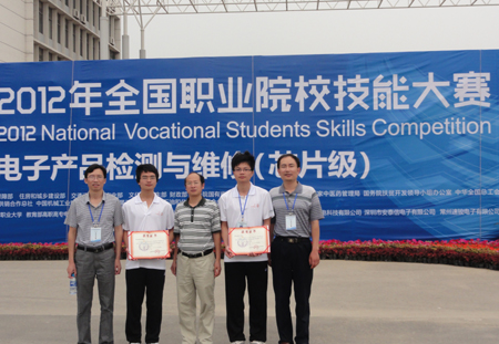 我院积极实施 “以赛促训,以赛促学,训赛相通”的教学改革,职业技能竞赛再传捷报。6月24日至6月30日,我院与株洲职业技术学院、湖南工业职业技术学院组成湖南代表队,参加了在天津职业大学举行的2012年全国职业院校技能大赛之“中盈创信”杯电子产品检测与维修(芯片级)竞赛。我院由电信系副主任谢完成带队,在刘理云、谢平老师的精心指导下,10电子大1班的吴贵炎,李文强两名参赛选手团结协作,沉着应战,顽强拼搏,克服各种困难,凭扎实的专业知识和精湛的技能,获得了团体赛三等奖。我院首次参加该赛项比赛的决赛,就取得了三等奖的成绩,充分展示了我院电子类专业人才培养模式改革的成效,显示了我院和湖南高职教育的实力。比赛期间,湖南省教育厅副厅长王键莅临比赛现场,慰问了湖南省代表队的各队成员。