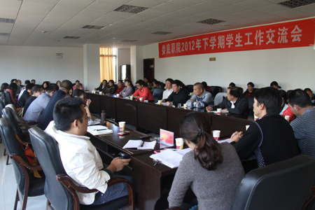 10月17日下午,我院2012年下学期学生工作交流会在综合楼招聘大厅召开。党委副书记欧友佳、副院长刘自斌出席并讲话,学工处、保卫处、后勤服务处负责人、各系部主任、总支书记、学工主任和全体辅导员参加会议。会议由学工处处长张一军主持。