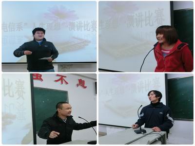 11月20日晚上,电信系在主教学楼310举行“人生理想”演讲比赛,出席比赛的有电信系学工主任李规、辅导员彭继光、李韶辉、梁飞翔,学工干事佘彬以及电信系11级学生代表和2012级全体新生。