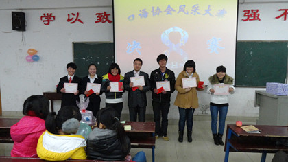 12月20日晚7点,外语系口语协会承办的第八届英语口语风采大赛决赛在主教楼110举行。担任此次大赛的评委有系主任刘燕、学工主任贺建良、教研室主任周萍、辅导员周春红老师,外语系全体学生和其他系部英语爱好者参加。