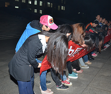 广场上,同学们手捧蜡烛,默默的站成了一个心形,没有言语,静静的为雅安祈福。随后,大家有秩序的依次在横幅上签下自己的名字,并在广场上放飞了满载祝福的孔明灯。不少教职工和教师家属也加入到祈福的心形阵列中来,活动持续了一个多小时。