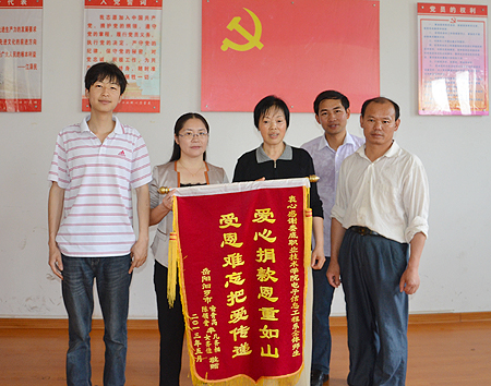 5月15日,10级软大2班喻齐相同学的父亲来到学院,向电信系、学院送上锦旗,感谢学院给予他儿子的爱心帮助。党委委员、副院长刘自斌关切询问喻齐相同学目前的身体状况及治疗情况,并代表学院向喻齐相同学的父亲送上学院的第二笔捐款共计11278元。院团委书记欧芳、电信系党总支书记吴莲贵、主任游新娥、学工副主任李规、系学工干事佘彬、喻齐相同学班主任吴喜平鼓励喻同学以积极乐观的心态战胜病魔,争取早日重返校园。
