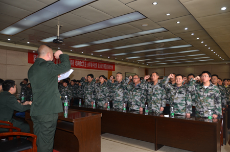 邹涛对我院民兵进行呼点。随后,在张明引领下,我院民兵重温了民兵誓词。