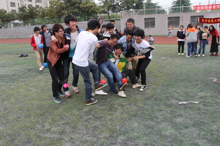 活动开始前,学生会将全系学生以楼栋为单位分为三个大组,寝室成员两人为一队参加活动。活动中,每一队中两人的脚用透明胶绑在一块,再将吹好的气球绑在其中一人的另一只脚上,在主持人一声开始后,同学们刚刚开始显得还有些缅甸和紧慎,但当第一个气球被踩爆了之后,现场的气氛也变得活跃起来,大家扭成一团,活动中充满了笑声,随着啪啪的气球爆炸声之后,渐渐场上的气球也慢慢变少,通过激烈的争夺,最终赵艺、周津玉组合在女生组中笑到了最后,而男生的二组中,许万鹏、杨敏组与彭彪、黄彪组也坚持到了最后。