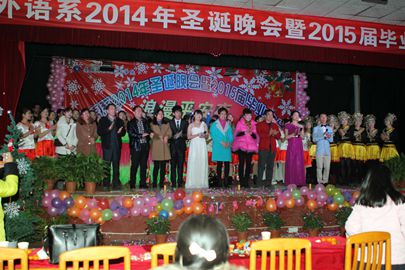 12月24日晚7:00,外语系精心策划的2014年圣诞晚会暨2015届毕业晚会在学院南苑礼堂隆重举行。出席晚会的有娄底梅山武术研究院院长刘福高,娄底蚩尤文化艺术团团长陈福云,武汉海天世纪船务有限公司经理丁辉,学工处副处长易瑜、李规等领导,外教Tom和Nemo,蚩尤文化艺术团演职人员,外语系全体师生及各系师生代表近1000多人。