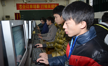 未经通知,记者悄悄来到苹果手机软件订单班上课的教室――实训楼516室探班。只见教室完全按照企业工作室格局进行布置,电脑、工作台整齐排列,企业文化宣传窗与标语悬挂在屋内墙面,师生们把这个充满企业氛围的工作间称为“师生创新室”。这堂课是“java语言”。只见谭政工程师在主控台上操作电脑讲解java语言的“前生今世”,同学们则看着自己的电脑,边听边按老师的指令动手操作。“我们采用模块化方式组织教学。按照苹果手机软件开发程序各模块,设计相对应的课程与教学内容,带来的全是最新最实用的技术。学完一个模块就会布置一个相关的工作任务比如制作一份有logo的简历、PPT比赛、用html程序作网站、用java语言制作一个游戏等,既实用又有趣,学生非常喜欢。然后会组织考试,合格后进入下一个模块的学习。这样下来,学生对相关的程序语言学得比较精,成为名副其实的准职业人。”谭政工程师告诉记者。