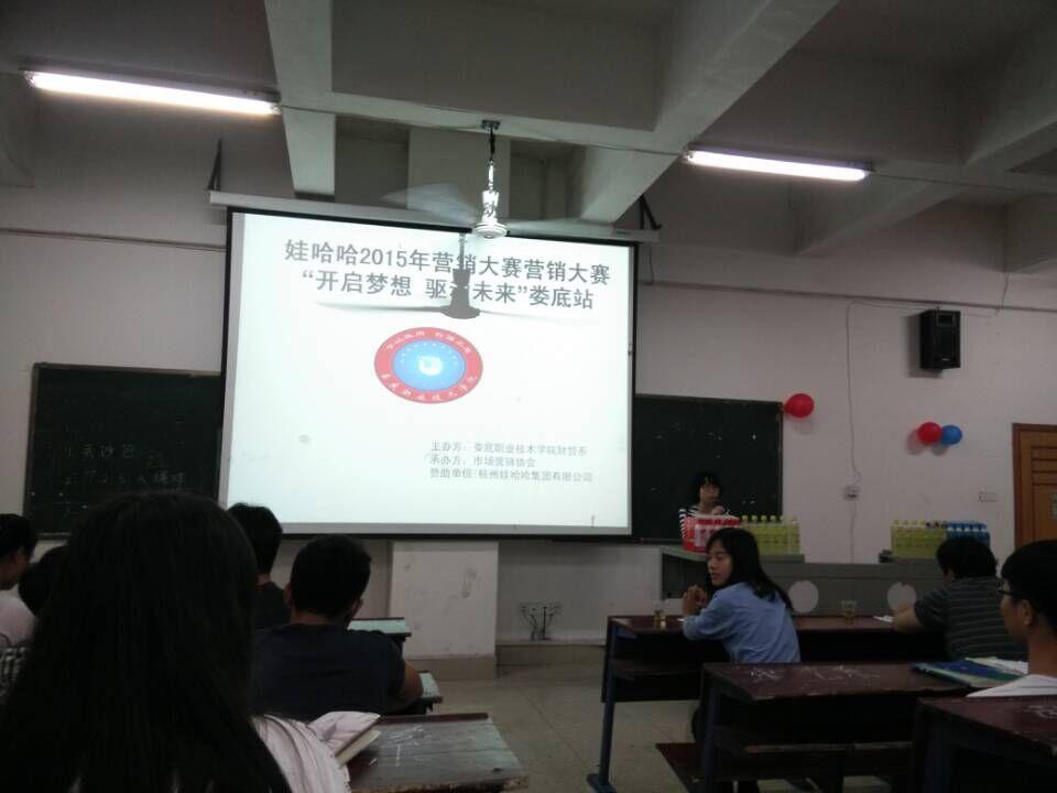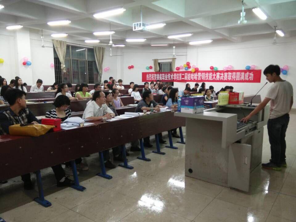 为了增强我院学生的营销技能、提高营销意识,由财贸系主办、市场营销教研室及市场营销协会承办的“2015年营销技能大赛”于5月28日晚7:30在主教楼110教室举行大赛决赛。财贸系党总支书记蒋美群、市场营销教研室主任陈志雄、专业教师卢特奇、吴梦华及娃哈哈公司代表王旭霞,担任了本次决赛的评委,财贸系主任王威然到会现场指导。