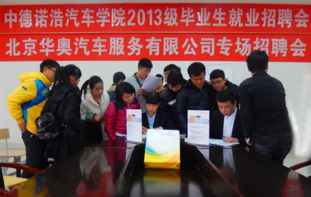 首先,苏院长讲话以及介绍本次来招聘的公司主要领导。面试之初,华奥公司李亮小姐对华奥公司的总体情况进行了一个大致的介绍。同时,李主管还对即将毕业走出大学校园的毕业生的人生职业规划做出了简要的概述,为学生们的职业定位提供了方向。李主管幽默风趣的谈吐给学生树立就业的信心。紧接着她还详细讲解了公司对招聘的基本情况包括工作性质、薪酬福利及职业发展方向等内容。整场招聘会现场,气氛良好,秩序井然,每位应聘者都信心满满,积极与招聘人员交流,主动了解用人单位的情况。华奥公司对此次招聘会也非常满意,一一为学生解答了他们的提问,并要求学生们保持健康的身体和积极乐观向上的心态,做好随时上岗的准备。两位主管温和的性情和对同学们的肯定大大加深了同学们对求职的信念与信心。通过双向选择,共有16名13级学生与华奥公司签订了就业协议,其中汽车技术服务与营销专业10名,汽车检测与维修专业6名。