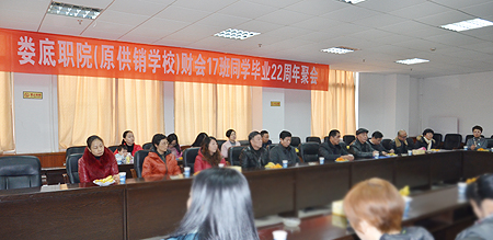 | 2016年1月2日,财会17班校友回母校欢聚。22周年聚会座谈会在综合楼二楼会议室召开,院长雷立成,副院长刘自斌,学院老领导朱建国,财经贸易系主任王威然,党政办副主任罗平良,原财会17班班主任曾加荣、祖宾,教师代表吴丽娟、李飞轮等参加了座谈会。财会17班校友、新化县政法委副书记罗崛主持座谈会。 师生们观看了母校发展历程视频。罗崛介绍了班级的基本情况。他说,财会17班有53人,在母校和老师们的谆谆教导下,大都成长为单位的栋梁与骨干,并经常保持着联系。娄底市委组织部副处级组织员、干部一科科长肖静讲话,对母校数年来翻天覆地的变化,取得的巨大成绩表示祝贺,抒发了校友们祝愿母校欣欣向荣、日益强大的心声。班主任祖宾老师回忆了班级的如歌岁月,师生间的种种情谊跃然心间。 刘自斌发表讲话,介绍了学院的基本情况,及校友会成立以来开展的各项工作,取得的成绩。他希望大家以母校为荣,与母校加强联系,与老师、同学保持联系,多聚聚,多交流。雷立成发表讲话,对同学们取得巨大成绩表示祝贺。他说,大家都是娄职大家庭的一分子,同学们的成绩就是母校的光荣。常回家看看,多回来走走,祝愿大家新的一年事业进步,万事如意! 财会17班校友、娄星区大科街道办事处党工委书记贺资斌、娄底联通公司经理周志平等代表班级向母校赠送了大幅牌匾和礼物,表达了对母校的感恩之情。(欧阳琦)