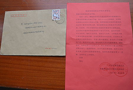 3月29日,我院宣传部收到一封来自西藏自治区那曲地区巴青县委宣传部的表扬信,信上说:“首先,感谢贵校学生次成旦巴同学在假期期间为巴青县各项事业所做的贡献,他们不忘自己的根源,在学校放假期间回到自己的故乡巴青,利用假期把学校所学的知识用于教导更多的人群,他们能够在自己的故乡开办培训班、扫盲班,并在空闲时间自发组织开展各项公益性活动,这与贵校辛勤淳朴的培养教育是分不开的……在他们所开办的培训班、扫盲班以及开展的公益性活动中,受益人数不断增加,普及的人员面越发广泛,现在不仅有小孩,更有成年人员自发接受教育。感谢贵校,培养出那么杰出的人才,用自身微弱的力量为巴青各项事业涌入一股清新源泉…… ”落款为“中共巴青县委员会、西藏那曲地区巴青县人民政府”,并盖上了大红公章(感谢信将我院错打字为“娄底职业学校”,但信封上手写的我院名称与地址无误)。