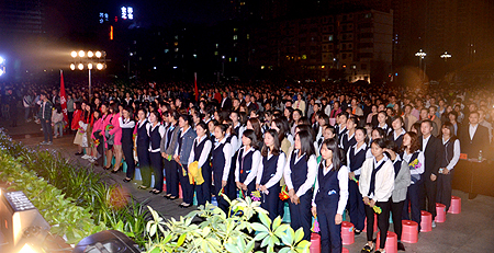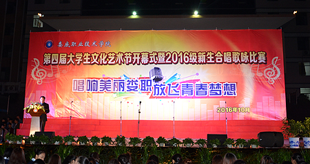 本网讯 10月16日晚,娄底职院“唱响美丽娄职放飞青春梦想――第四届大学生文化艺术节开幕式暨2016级新生合唱歌咏比赛”在该院文化广场隆重举行。