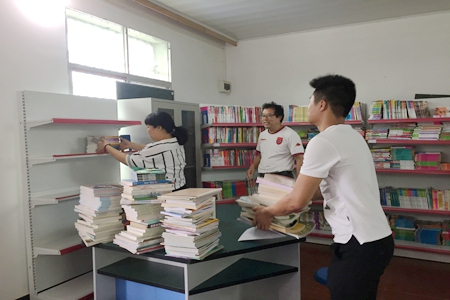 接着,社会实践小组人员搬出捐赠给孩子们的各类书籍、名著,为第二天搭建书屋做准备。