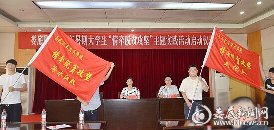 娄底新闻网讯(通讯员 欧阳琦)7月16日下午,娄底职院举行2017年暑期大学生“情牵脱贫攻坚”主题实践活动启动仪式。娄底职院党委书记李文莲为“情牵脱贫攻坚”新化队和冷水江队授旗,党委委员、副院长周志和主持仪式,团委书记刘媛解读了该院2017年暑期大学生“情牵脱贫攻坚”主题实践活动方案。