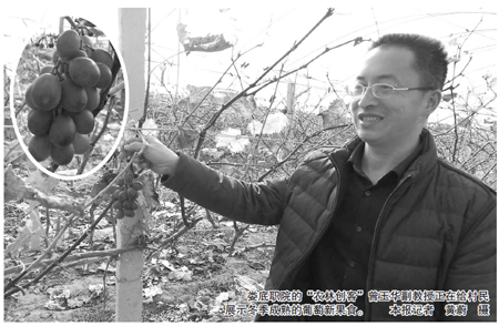 我们从娄底市驱车往郊区飞驰,很快就到了“院村合作”示范村——中阳村,在一片采摘完的葡萄园里,我们见到了被誉称为“农林创客”的娄底职院曾玉华副教授,他戴着眼镜,皮肤有点黑,但是脸上洋溢着一种知识分子才情和朴实农民的憨厚。