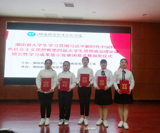 5月27日,由省教育厅举办的全省大学生学习贯彻习近平新时代中国特色社会主义思想暨大学生思想政治理论课研究性学习成果展示竞赛高职高专组决赛在湖南机电职业技术学院举行,我校辜桃、胡星星老师指导,杨丹、陈雅怡、唐婧、赵紫云和向紫霞5位学生组成的我校大学生学习贯彻习近平新时代中国特色社会主义思想暨大学生思想政治理论课研究性学习小组力压群雄,荣获二等奖。