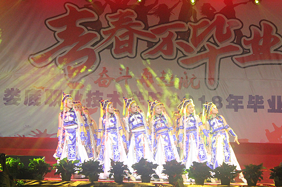 文艺晚会13个节目是在校师生奋战数月的心血之作,校艺术团的骨干们挑起了舞台的大梁。朗诵《梦起航的地方》、独唱《写给未来的自己》、校园歌曲联唱带毕业生们回归三年间在母校的点点滴滴;市花鼓剧团献上的小品《洗脚》说的是亲情的无私,而师生情又何尝不是如此;舞蹈《飞翔》、《你好明天》寄托着母校对即将起航的学子最真挚的期盼与祝福;街舞《酷酷的青春》、《鸿雁》、时装表演《青春style》展现着娄职学子的青春气质与艺术才华;歌伴舞《中国进入新时代》气势磅礴,见证着娄职人走入新时代,开启新征程的雄心壮志。