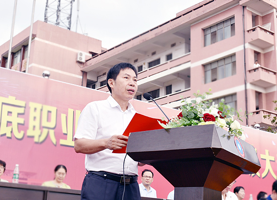 9月22日,秋高气爽。上午8点,我校2018级大专新生开学典礼暨军训汇报表演在田径运动场隆重举行。娄底市教育局局长李耀文、娄底军分区常委、战备建设处处长彭文、娄底市教育局党组成员肖志治、娄星区武装部副部长龙逸群及全体校领导出席。各院部处室主要负责人、辅导员、教师代表、全体军训教官、2018级全体新生参加。典礼由校党委委员、副校长周志和主持。