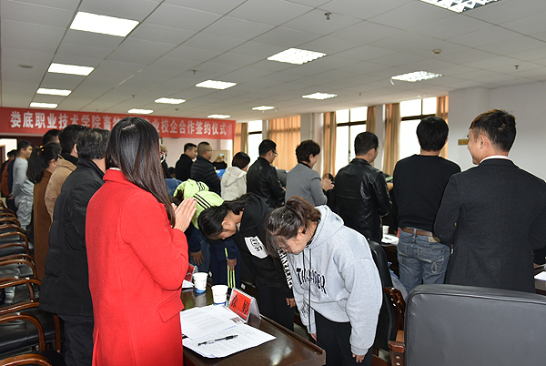 在与会领导的共同见证下,刘梅秋与唐人神集团、长沙市仁才宠物医院、郴州市酷狗宠物医院、湘潭市爱康宠物医院等12家企业签订了校企合作协议。随后,畜牧兽医专业学生代表列队走到各位企业家面前,行拜师礼,企业代表湘村高科农业股份有限公司总兽医师张嘉麟与学生代表欧阳天胜分别发言,表示双方将不辜负这一良好平台,教学相长、共同提高,搭建人才培养的“直通车”。