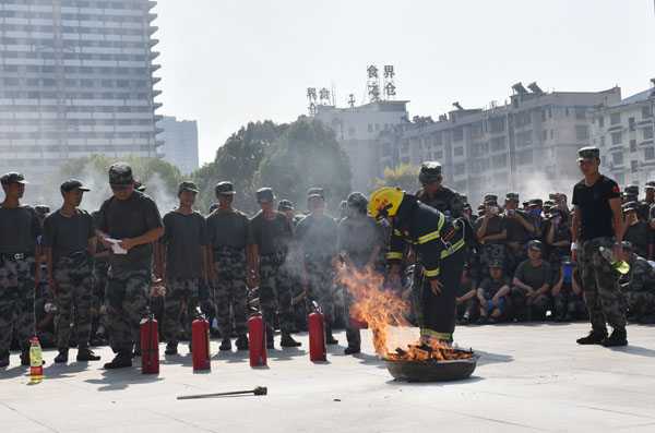 随着校园广播传来“险情”,校园内警报声大作,全体大一新生在军训教官和老师的引导下,按照火场逃生疏散演练技巧,沿着墙根、楼梯用毛巾捂住口鼻,弯腰低姿快速撤离到安全地带。之后,消防教员向同学们讲解了学校常见火灾隐患,发生火灾后如何报警,火灾的预防,初起火灾的扑救措施以及日常生活中用火用电常识和被困火场如何逃生等消防知识,并现场演示了初起火灾扑救方法,手把手指导灭火器的实际操作,组织学生体验了一把“火盆灭火”。